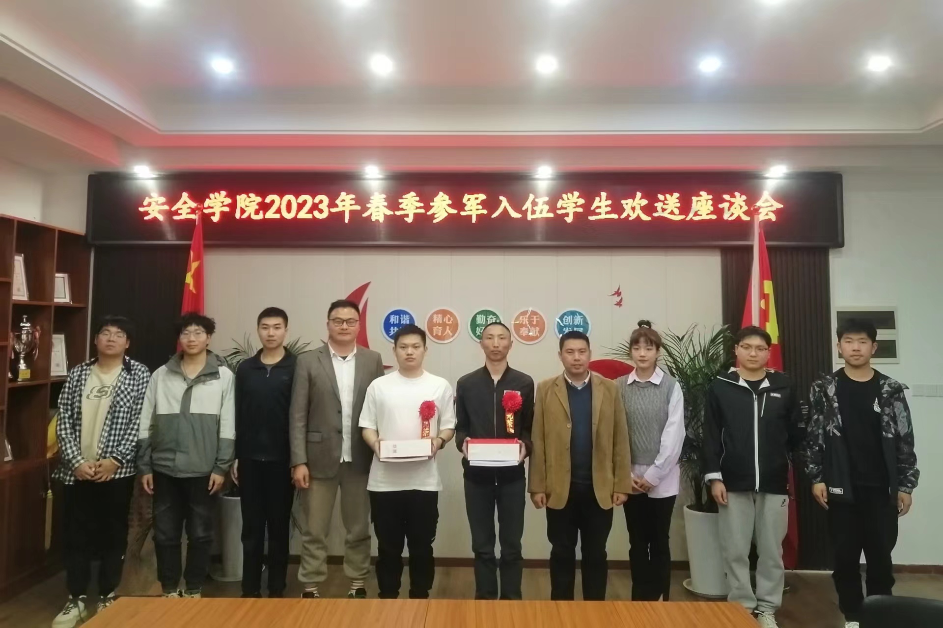 3月6日下午,安全学院2023年春季参军入伍学生欢送座谈会在宁远楼412召开。学院分管学生工作负责人、辅导员、退役复学“老兵”代表以及学生代表参加了欢送座谈会。