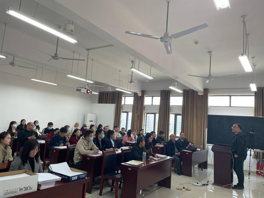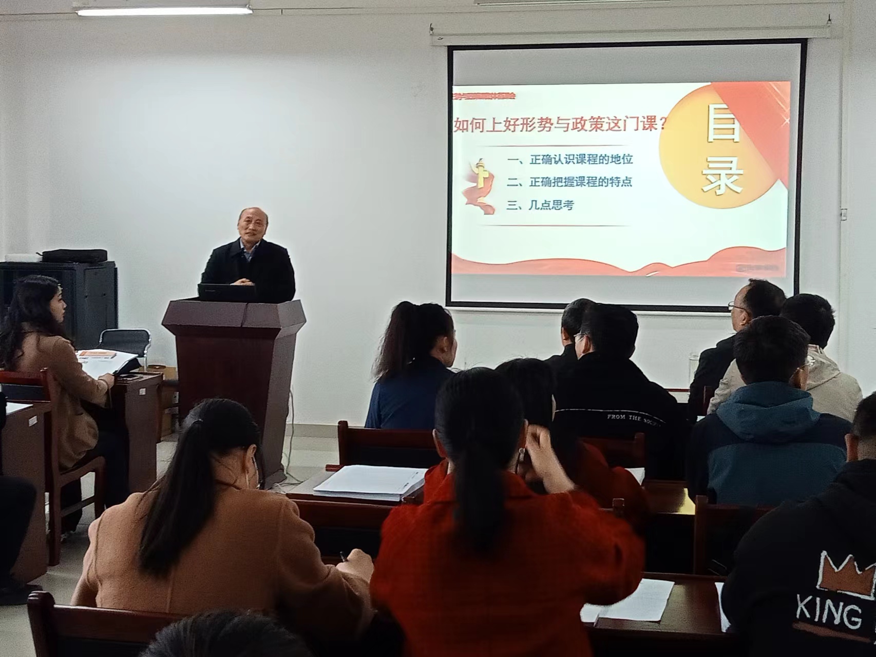 教研室邀请矿业工程学院党委书记盛鹏飞围绕“如何上好形势与政策课”主题,从形势与政策课的课程地位、教学特点和几点思考三个层面展开了系统论述。他强调,要认清形势与政策课的重要地位,把握课程性质,明晰教学特点,用心教好这门必修课,并分享四点教学感悟:一是全面把握“形势与政策”教学要点;二是创新教学方式以优化备课环节;三是丰富教学形式以活跃课堂氛围;四是采取专题分组以提升授课效果。