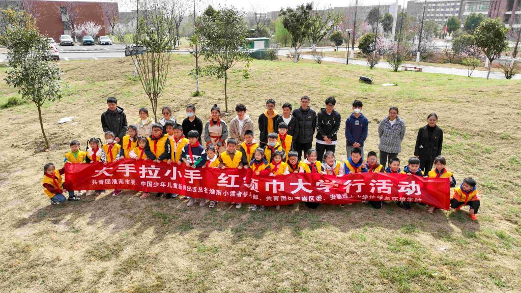 “什么是双碳?”“这是什么石头?”3月12日,在中国水日来临之际,时值植树节,由共青团淮南市委、淮南市少工委、中国少年出版社淮南分社、安徽理工大学地球与环境学院、共青团田家庵区委共同组织开展“大手拉小手·红领巾大学行”系列活动,50余位小朋友和家长与大学生党员志愿者参与添绿护绿。