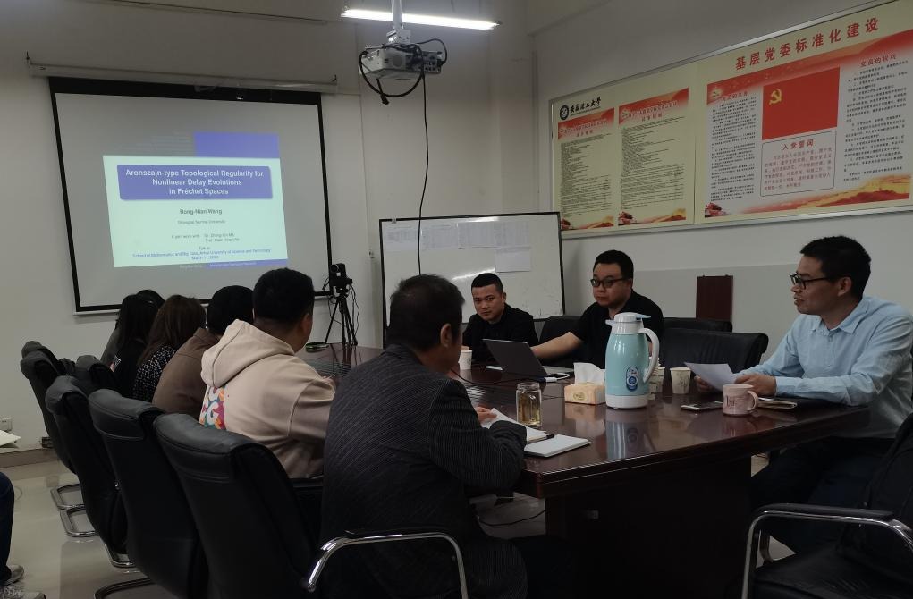 3月10日至12日,应科研部和数大学院的邀请,上海师范大学王荣年教授、陈慧妲博士,长江大学李勇教授、硕士研究生李妍应邀来院开展学术交流,并于11日分别作了题为《Aronszajn-type Topological Regularity forNonlinear Delay Evolutionsin Fréchet Spaces(Fréchet空间中非线性时滞演化的Aronszajn-型拓扑正则性)》与《Global dynamics of tuberculosis model and cost-effectiveness analysis(结核病模型的全局动力学与成本效益分析)》的学术报告,学院微分方程与动力系统团队成员等20余人听取了报告。数大学院院长赵前进主持报告会。