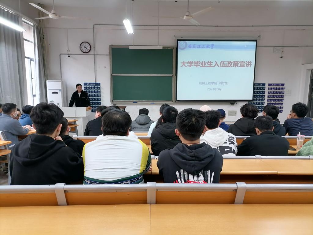 为深入贯彻落实习近平强军思想,推进新时代强军事业,进一步激发广大学子携笔从戎、献身国防的热情,充分调动学生报名参军积极性,3月15日下午,机械工程学院在天工南102教室举办2023年大学毕业生入伍政策宣讲会,学院党委副书记张岚、全体辅导员、2023届部分学生代表、有入伍意向同学近百人参会。