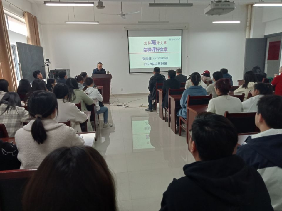 张治栋教授以《文科学术文章的撰写方式与基本要求》为题,详细地从怎样写好文章和怎样评好文章两方面与各位教师展开交流,强调一篇高质量文章重在有意义、能写好、有哲理、有点赞和有贡献,强调评一篇好文章必须从思想性、学术性、理论性、前沿性和原创性五大方面去观察与斟酌。