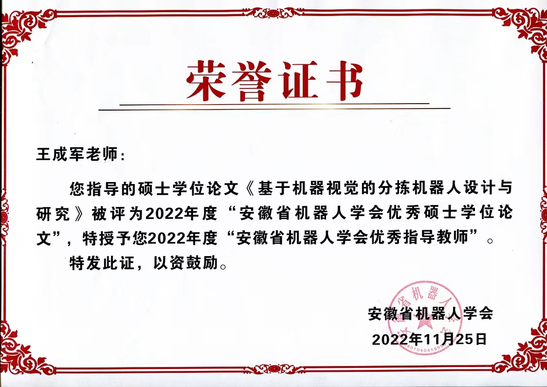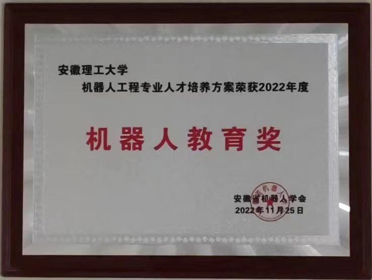 大会期间,安徽省机器人学会为安徽理工大学人工智能学院颁发了“机器人教育奖”,表彰我校《机器人工程专业人才培养方案》荣获2022年度本科优秀人才培养方案,肯定了我校机器人工程专业人才培养成效和特色。韦志文同学的硕士学位论文《基于机器视觉的分拣机器人设计与研究》荣获2022年度安徽省机器人学会优秀硕士论文,王成军教授荣获2022年度安徽省机器人学会优秀指导教师。