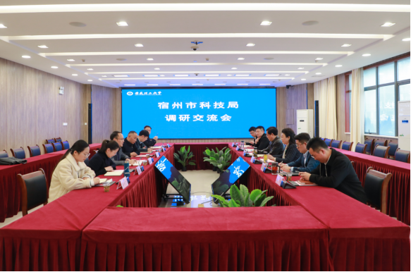 3月21日下午,宿州市科技局副局长王慧,安徽万硕科技产业(集团)有限公司董事长、校友祝云辉一行6人来校调研校地合作工作。科研部负责人主持调研交流会。