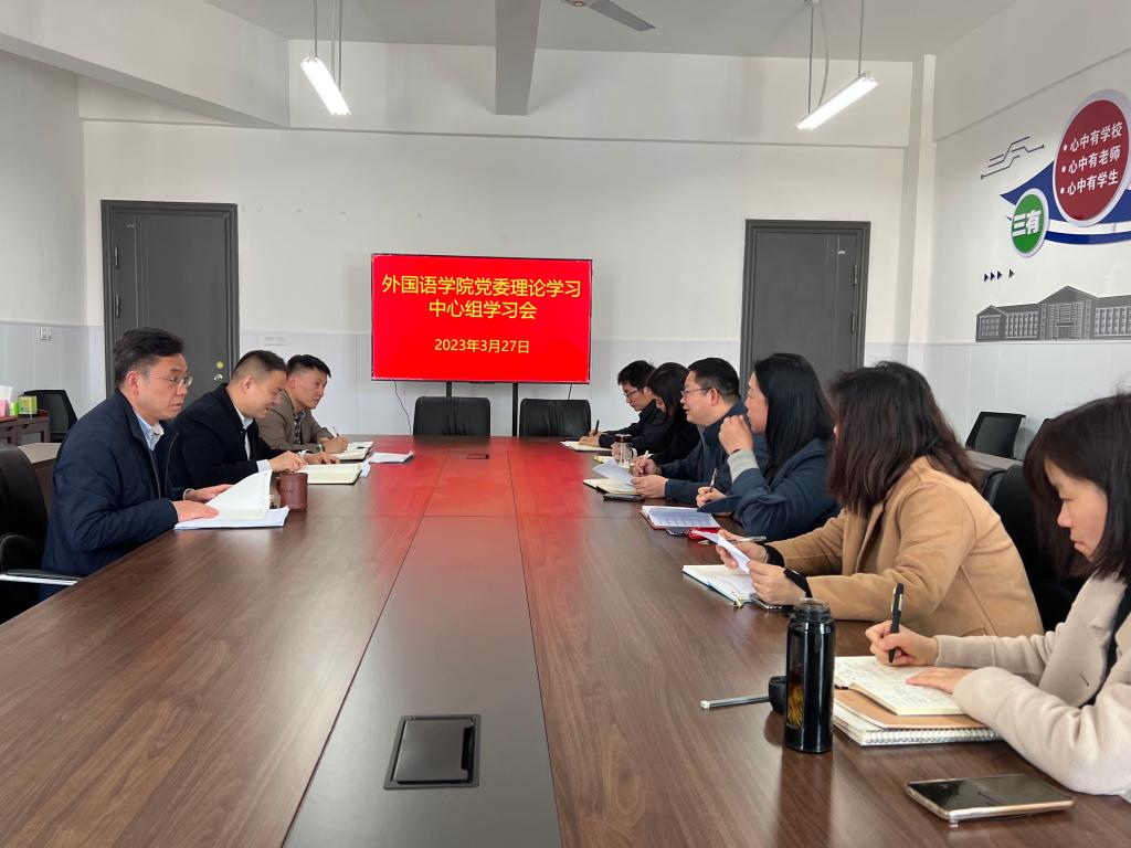 3月27日下午,外国语学院在崇智楼B203召开党委理论学习中心组学习会,深入学习习近平总书记在全国两会期间发表的系列重要讲话精神和全国两会精神,认真学习领会习近平总书记为《复兴文库》所作《序言》的重要精神,研讨学习中共中央办公厅印发《关于在全党大兴调查研究的工作方案》文件精神。学院党委理论学习中心组全体成员参加,学院党委委员、副院长李争轮值领学。