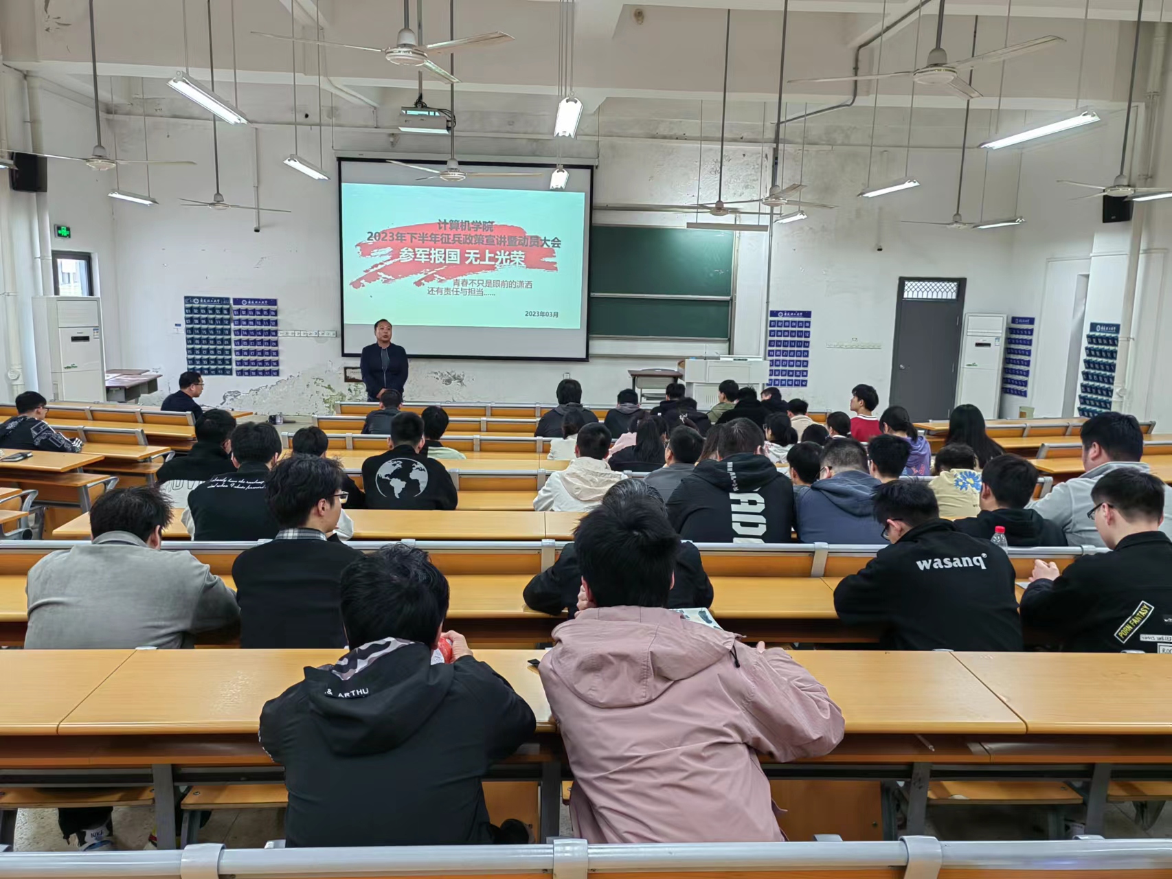 为教育学生响应国家号召,鼓励更多大学生投身军营,3月28日下午,计算机学院在天工105教室召开2023年下半年征兵政策宣讲暨动员大会。学院党委副书记刘中廷、学院征兵联系人、毕业班辅导员和学生以及低年级有入伍意向的学生参加大会,动员会特别邀请校征兵工作站老师进行征兵政策解读。