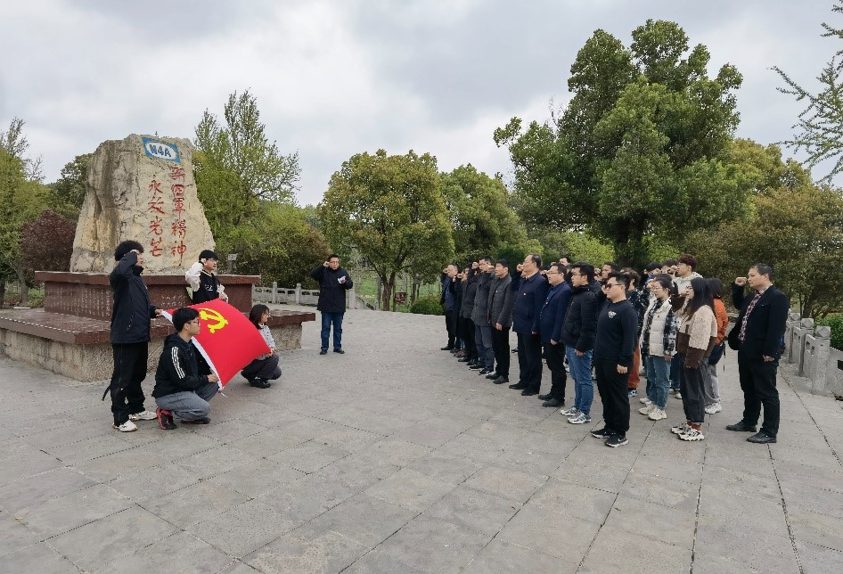 教工党支部全体党员,本科生第一、第二党支部师生党员代表前往淮南市上窑新四军烈士陵园参观。活动现场,全体人员向烈士纪念碑敬献花篮挽联,整齐肃立,鞠躬默哀,表达了对革命烈士的崇高敬意和深切怀念。在新四军纪念林,在场党员面向党旗,集体宣誓,重温入党誓词,坚定理想信念。