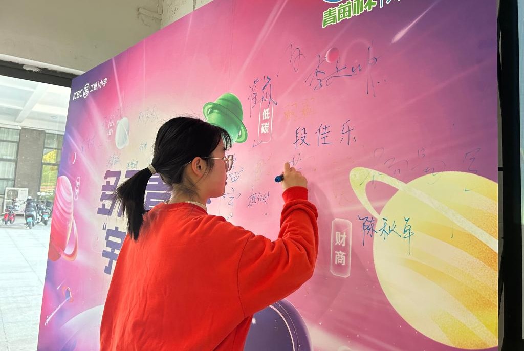 活动结束后,同学们现场参观了“青苗杯”优秀项目展示,并进行现场签名活动。现场还设置了工商银行金融产品相关展架,进行互动体验活动,同学们扫码领取小礼品,提升金融服务体验感。