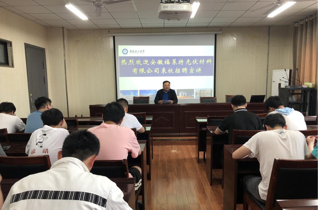 4月18日下午,安徽福莱特光伏材料有限公司董事长时志军一行到矿业工程学院开展交流并开展专场招聘宣讲。双方在宁远楼A406会议室进行交流座谈,就业创业指导中心、矿业工程学院主要负责人参加座谈。