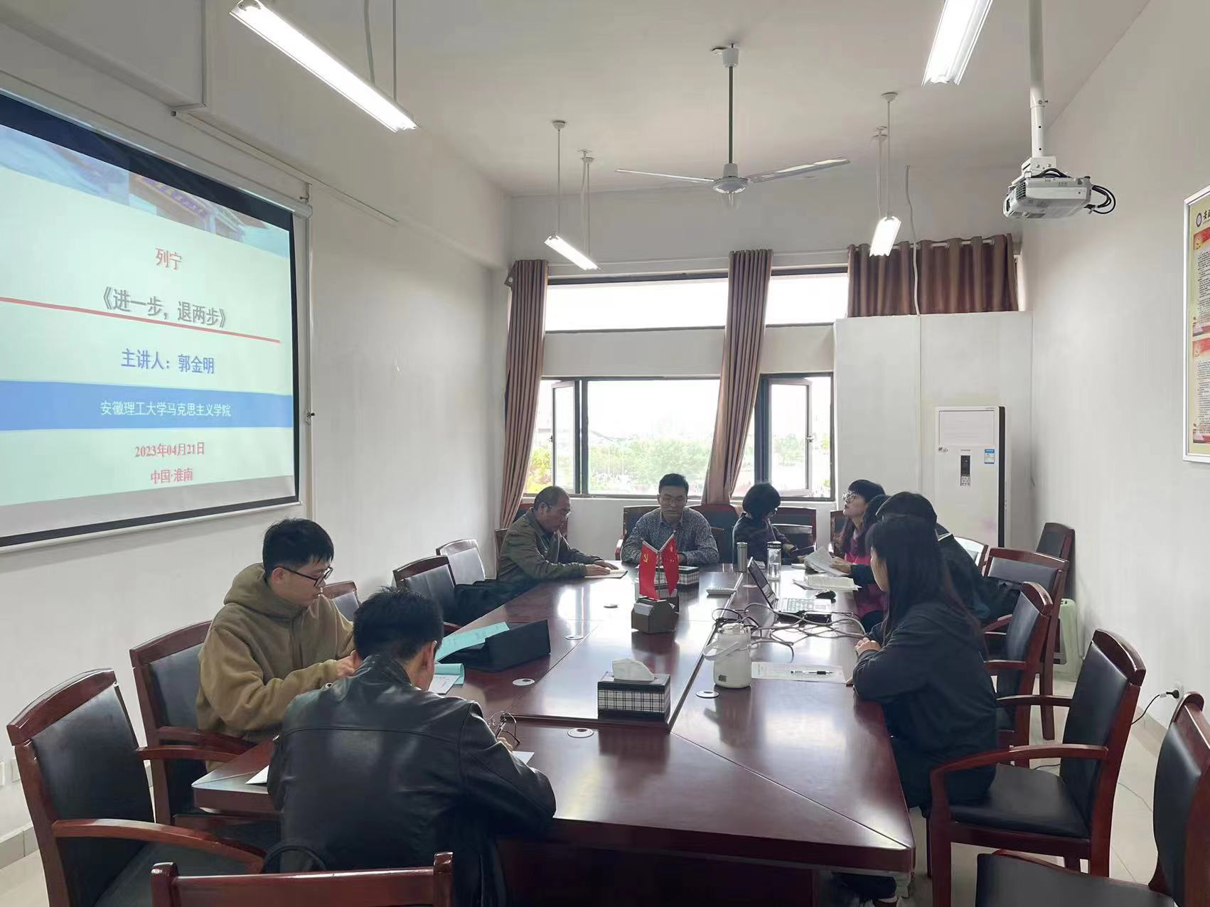 郭金明教授作“列宁的《进一步 退两步》”主题报告。《进一步退两步》写于1904年2月至5月,共18章,外加序言和附录,写于俄国社会民主工党第二次代表大会半年之后。报告内容十分丰富。郭金明从“写作背景”、“人物关系”、“精彩片段解读”和“总结与思考”等部分进行全面深入地分析,结合自己的研读体会,阐明了列宁关于党的组织建设的重要思想。结合主题报告,与会教师就列宁这部作品的理论和实践意义以及“进一步 退两步”的题目涵义,结合文本,积极参与研讨,形成共识。本次活动在智慧的碰撞中圆满结束。
