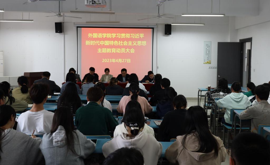 4月27日下午,外国语学院在崇智楼B233报告厅召开学习贯彻习近平新时代中国特色社会主义思想主题教育动员会,对学院开展主题教育进行动员部署。学院党政领导班子成员和全体师生党员参加会议,学院党委主要负责人作动员部署讲话。