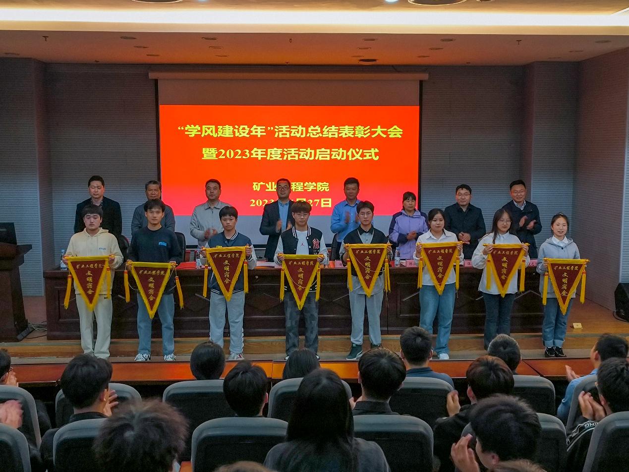 学院副院长张向阳宣读了《关于表彰矿业工程学院“学风建设年”活动先进集体和先进个人的决定》,学院副院长殷志强宣读了《关于公布“矿业工程学院第二届优秀学术成果”海报展评选结果的通知》。学风建设优秀班级代表、学风建设优秀学生干部和“双创之星”代表从班级学风建设、班级干部在学风建设中的作用和参加科研竞赛的收获与成长等角度分享了学风建设经验。随后,学院党政班子成员和应邀代表分别为获奖的先进集体和个人进行颁奖。