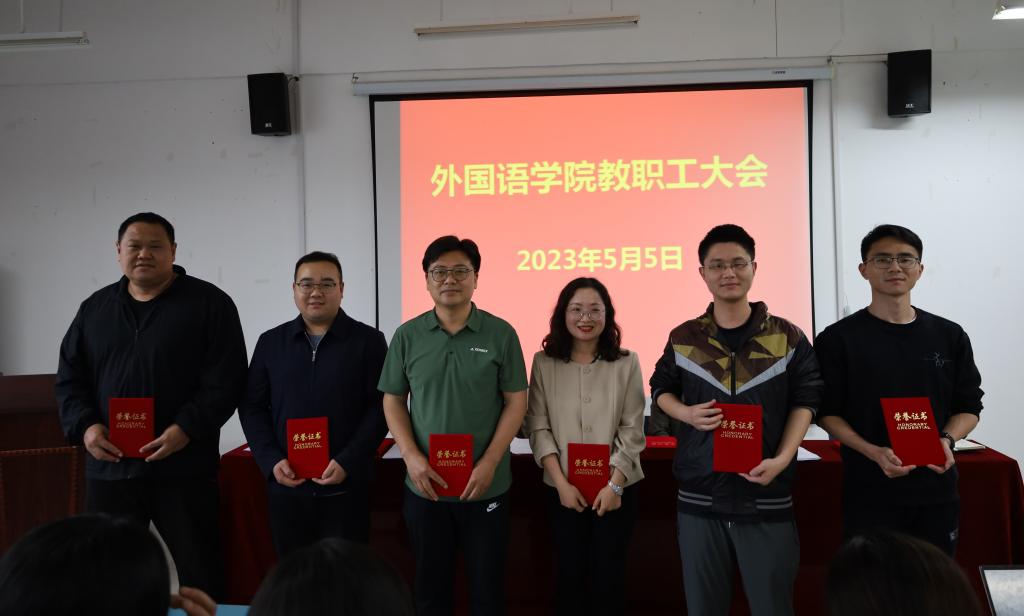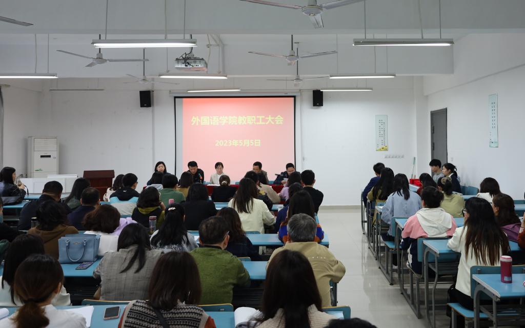 5月5日下午,外国语学院在崇智楼B233报告厅召开教职工大会,表彰先进教师,部署学院工作。学院党政领导班子成员和全体教职工参加会议。