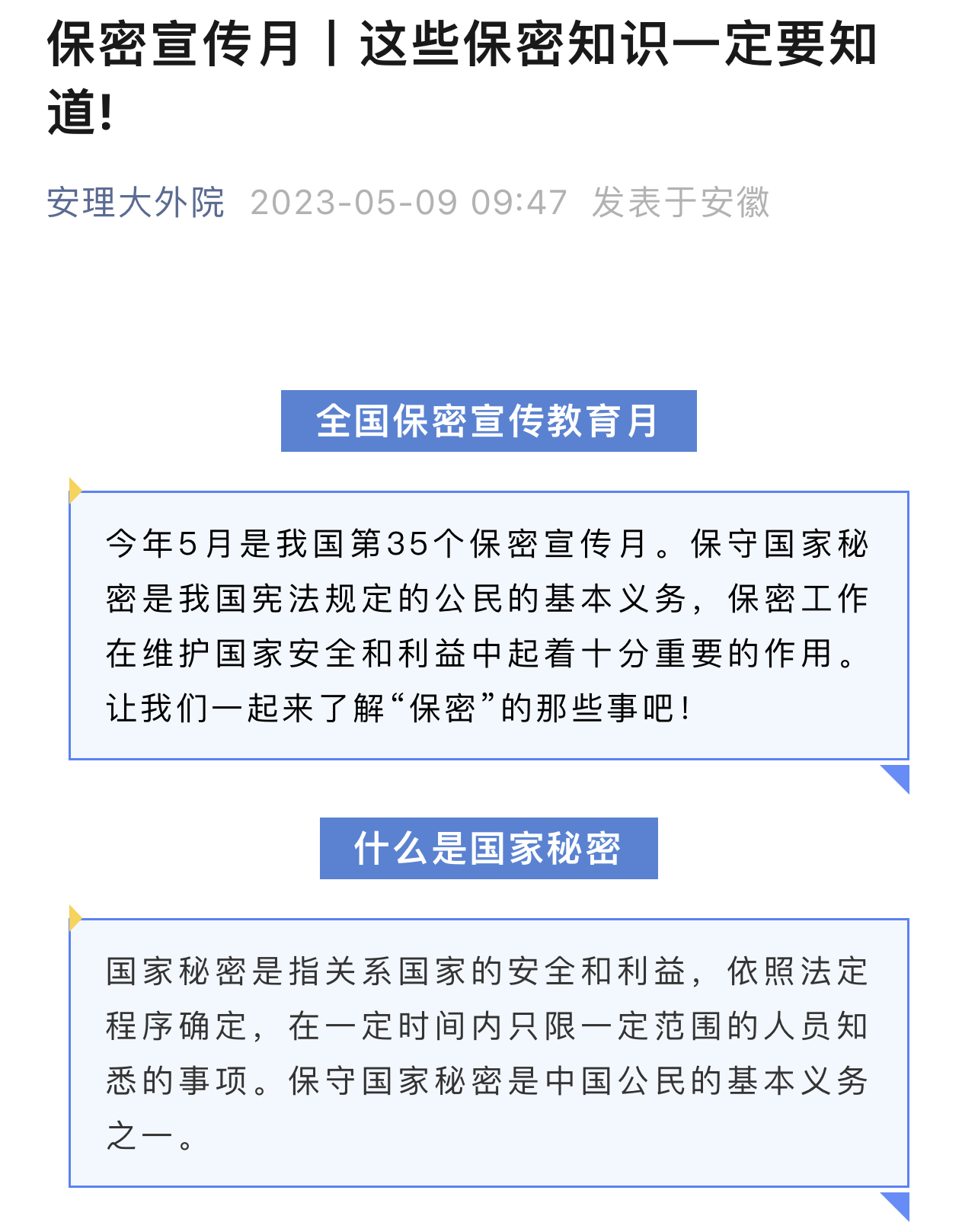 5月9日,外国语学院微信公众号编辑发布题为《保密宣传月丨这些保密知识一定要知道》推文,详细介绍日常生活中有可能造成国家秘密泄露的各种行为,增强广大师生的保密意识,使师生深刻认识到保守国家秘密是每个公民应尽的义务,形成了人人重视保密,共筑保密工作坚固校园防线的良好氛围。