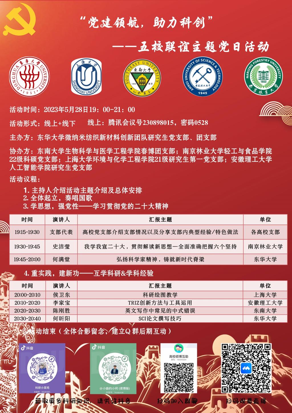 为深入学习贯彻习近平新时代中国特色社会主义思想,推进主题教育走深走实,5月28日晚,由东华大学微纳米纺织新材料创新团队研究生党支部主办,安徽理工大学人工智能学院研究生党支部协办的长三角地区高校研究生党支部联学共建主题活动成功举行。来自东南大学、上海大学、南京林业大学的研究生党支部近百名党员共同参加了此次活动。