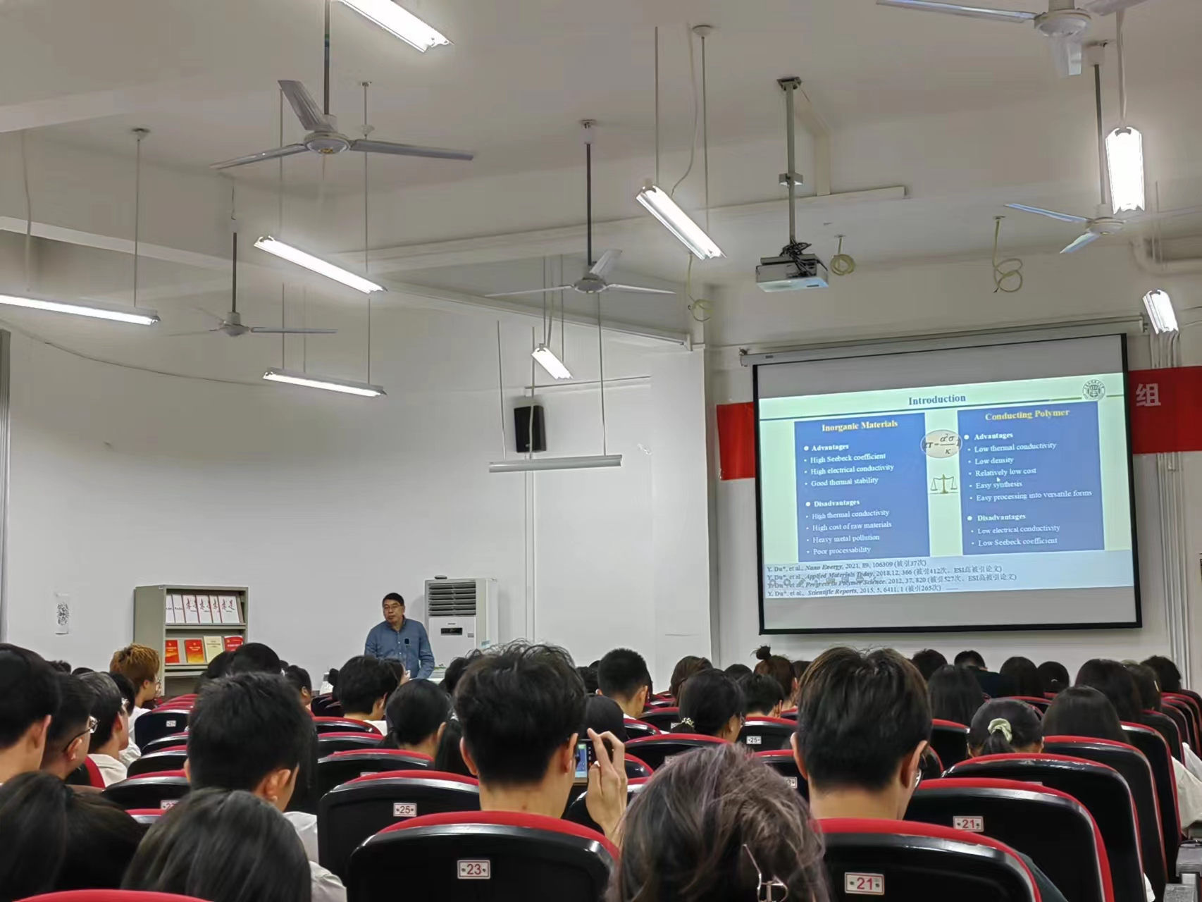 杜永教授解释了热电器件的原理,强调了柔性聚合物基复合热电材料具有可弯折、体积小、质量轻等优点,适用于制备可穿戴电子设备等;对目前柔性热电材料的研究热点聚乙烯苯磺酸和聚苯胺等的制备方法、形貌性能进行了阐述;介绍了丝网印刷、滴涂成膜及喷墨打印等技术制备热电器件的方法,指出合理地设计柔性热电器件构造,实现能量输出的最大化,是柔性热电器件发展的方向之一。杜永教授的学术报告内容丰富、图文并茂,报告深入浅出、站位高远,开阔了学院青年教师和研究生在柔性热电材料方面的学术视野。
