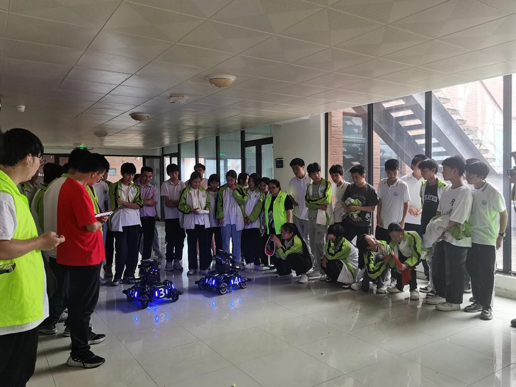 随后,同学们来到工程实训中心的3D打印室、机械加工室,由机器人协会和航模协会开展机器人操作和飞机模型的展示活动。讲解员详细介绍了智能机器人的工作原理和适应场景,并进行实际的操作与展示,鼓励同学们敢于探索追求创新,做一个有独立思考能力的中学生。