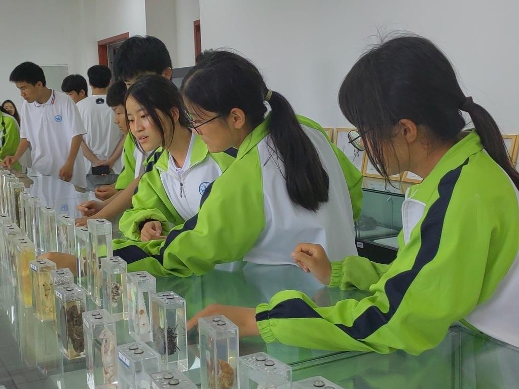 在学生讲解员的带领下,同学们首先来到地环学院的地质展厅。化石、矿石、标本,一件件作品让学生徜徉在古老的地质世界。同学们认真聆听讲解员的讲解,现场学习标本的辨认,气氛热烈欢快。