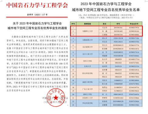 6月20日,中国岩石力学与工程学会发布了《2023年城市地下空间工程专业百名优秀毕业生的通报》,我校土木建筑学院城市地下空间工程专业2023届毕业生司志伟、朱鑫、江颖楠3位同学获评“百名优秀毕业生”。