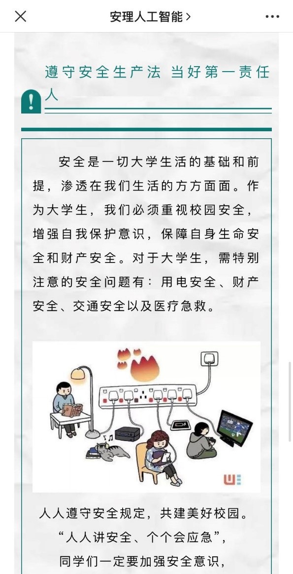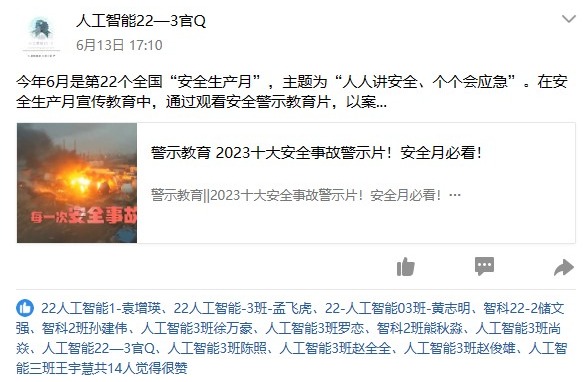为深入推进学习贯彻习近平新时代中国特色社会主义思想主题教育,全面贯彻落实学校学生安全教育和管理工作要求,提升广大师生的安全感和幸福感,人工智能学院开展“人人讲安全、个个会应急”的安全生产月系列活动,不断强化学生安全意识,筑牢学生安全防线。