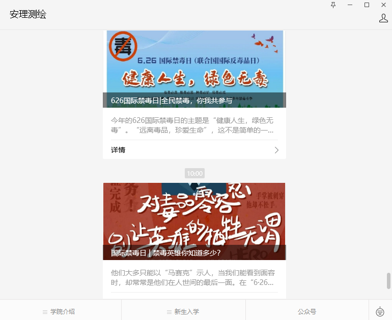 发布禁毒日专题推文。学院充分利用微信公众号“安理测绘”平台,围绕禁毒英雄事迹介绍和禁毒法规相关案例,图文并茂地向大学生普及毒品的种类及危害,让学生在感受先烈勇敢无畏、不屈不挠的禁毒精神的同时,筑牢抵御毒品的思想防线。