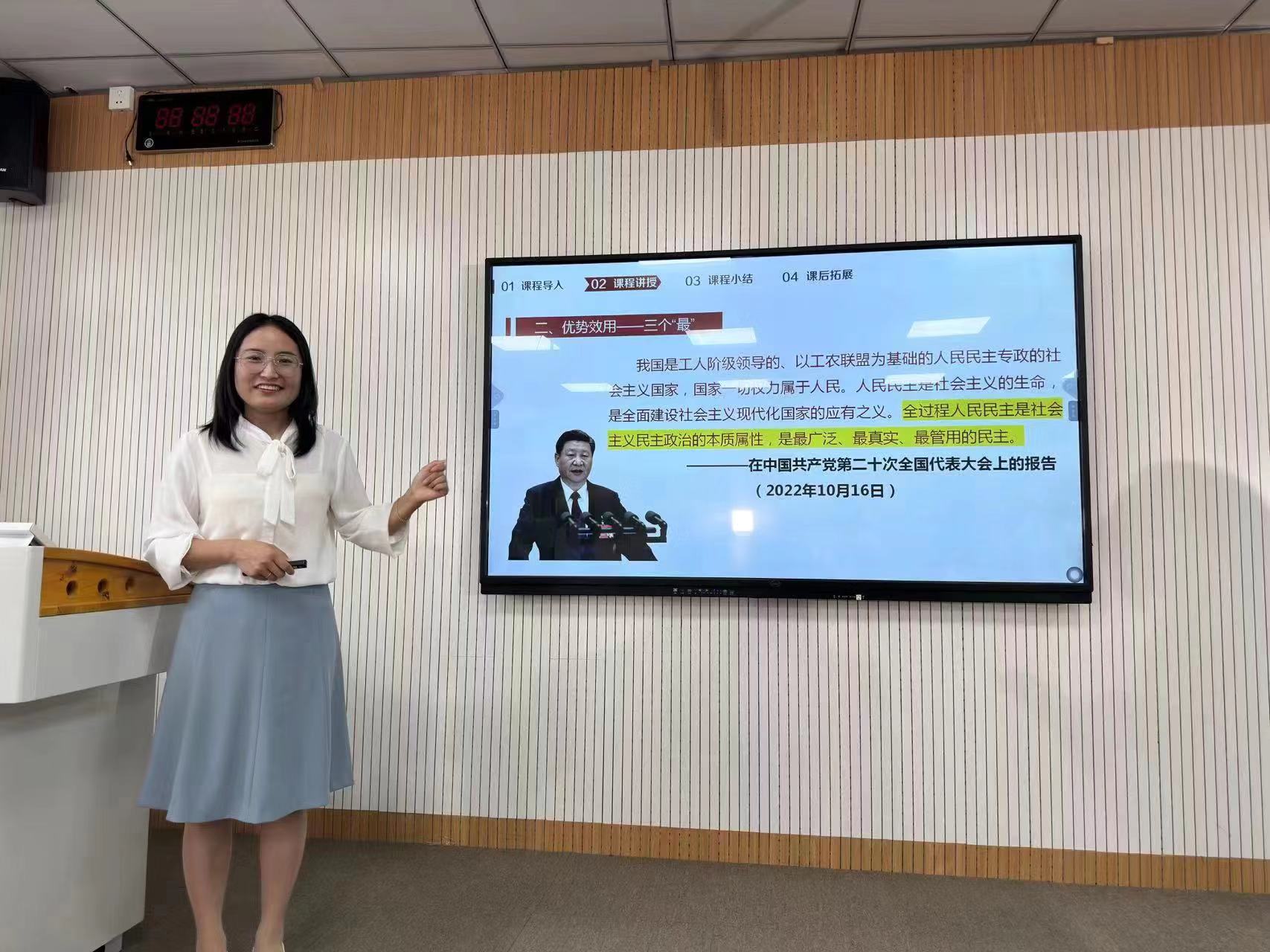 在讲课环节,中国近现代史纲要教研室的青年教师杨帆以“全过程人民民主”为题进行了教学展示,她从历史、理论和实践三个维度论证了全过程人民民主是最广泛、最真实、最管用的民主。接着,信息与计算科学22-2班的李万鑫、应用化学22-2班的孙婷婷、电子商务22-1班的吴长兴、网络与新媒体22-1班的朱佳慧、高分子22-1班的韩沐雨等5位同学也相继登台讲授思政课。这5位同学都是从校大学生讲思政课比赛中遴选出的优胜选手,他们紧扣教学主题,或是痛诉近代中国日益沉沦的风雨飘摇,或是阐述中国共产党苦难辉煌的革命征程,或是讴歌中国特色社会主义的伟大成就,或是表达新时代新青年的使命担当。
