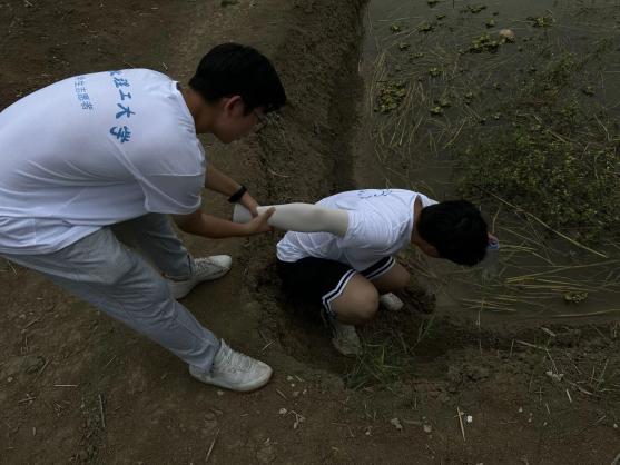 专业赋能,数据检测守护家园。为获得真实的水体污染指数及水中微生物含量等数据,本着实践与科学同行,专业助力调研的精神,团队成员对当地水体进行采样及编号。由于调研地点水体距离道路较远且与地面距离较大,队员们采用“人绳”战术合作取水,在保障自身安全的情况下顺利采集样本。样本将会被带回学院实验室进行化验,以此来判断水体是否被污染,此举也是检测先前水治理是否成功以及治理过后水体环境是否得到保持情况的有效方法。