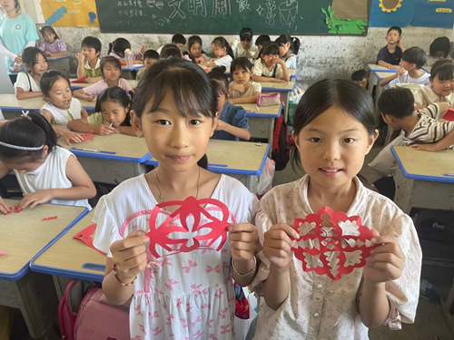 手工剪纸,传承非遗。为充分展现非遗剪纸的艺术魅力,继承和弘扬传统文化艺术,志愿团队举办了“弘扬民族文化、传承非遗经典”剪纸活动。队员们按照要点仔细地剪着手中的剪纸,时而转动着手中的纸,时而调整剪刀的角度,剪纸在手中上下翻飞,随着时间推移,大家手中的作品也渐渐成型。孩子们迫不及待地从志愿者手中接过红彤彤的剪纸,一边听着志愿者细致的讲解,一边不停地按照示范翻折剪裁手上的剪纸。孩子们亲手制作剪纸,传承的火花已悄然在心间绽放。