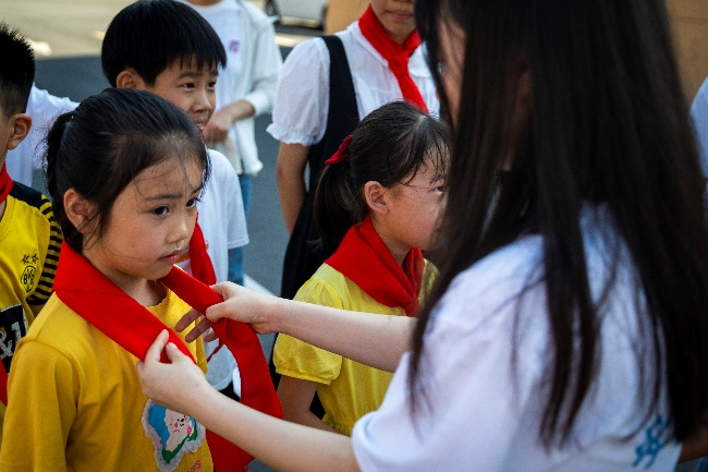 生逢盛世,肩扛重任,不负青春,不负韶华。红色传统教育要从娃娃抓起,实践团走进乡村,走进留守儿童内心,为农村留守儿童开展党史教育,让红色基因深深根植于青少年的心灵,引导其树立正确的世界观、人生观、价值观。站在校园外,实践团成员为留守儿童戴上红领巾,与少先队员们进行互动。步入课堂中,志愿者老师带领孩子们歌唱少先队队歌,昂扬的队歌让孩子们兴奋不已。党史小故事和红军长征故事被志愿者们讲述得有温度、有启发。孩子们聚精会神听着,对红色文化有了更深入的认识。