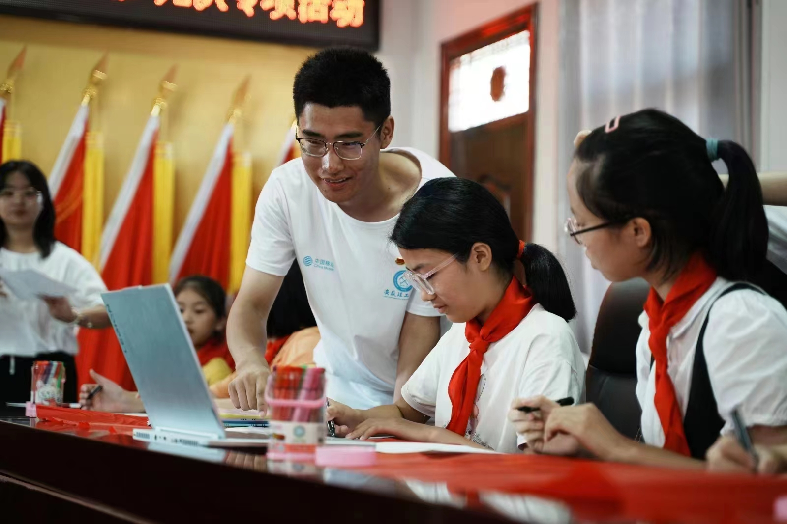 为推进“党团队”一体化建设,让红色教育在团队之间与党团之间实现顺利衔接与过渡,团队成员带领留守儿童辨识党旗、团旗和队旗,并一起学习领悟每一面旗帜的深刻内涵。最后,志愿者希望青少年们珍惜来之不易的生活,永葆爱党爱国的热情。红色党史课为留守儿童打开了一片别样的天地。