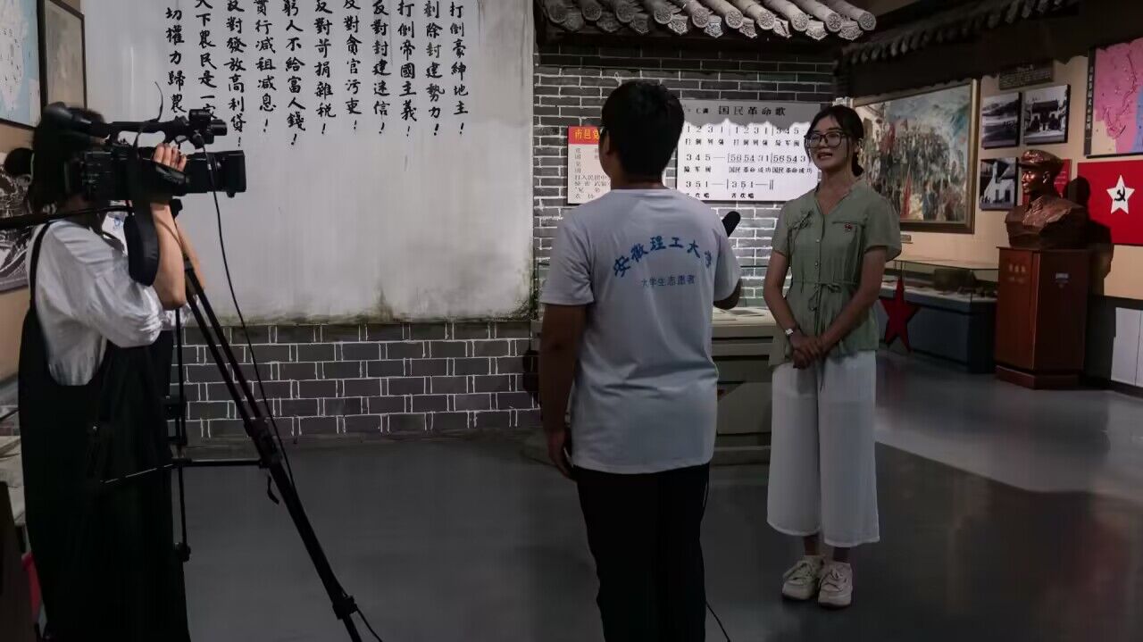 一次采访:在革命博物馆内,“三下乡”团队接受了金寨县融媒体中心(广播电视台)的采访,团队成员和指导教师分别就“调研心得”、“调研期望”作了交流分享,团队中的本地成员也表达了对家乡的热爱之情,决心厚植乡土情怀、努力学好本领、助力家乡发展。