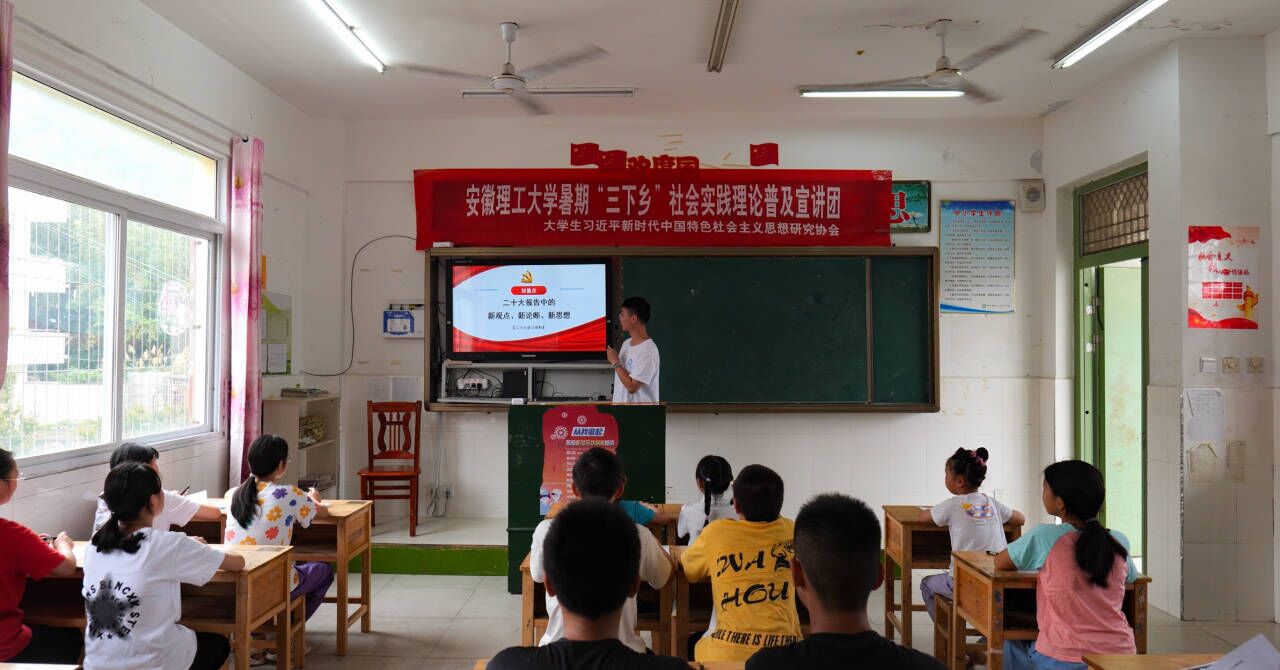 为践行习近平总书记对新时代青年的殷殷嘱托,团队成员前往金寨县三合初级中学,向当地学子进行了理论宣讲。7月17日,团队成员姜亚豪围绕党的二十大中提出的新观点、新论断、新思想进行了理论宣讲,促进党的二十大精神宣传贯彻入脑入心。陈祺从“学思想、强党性、重实践、建新功”四个方面,用通俗易懂的语言为同学们讲解了学习贯彻习近平新时代中国特色社会主义思想主题教育的总要求。张梦晗为同学们带来主题为“守望绿水青山,共享金山银山美好未来”的理论宣讲,让同学们对“习近平生态文明思想”有了更为清晰的认识和理解。同时,团队成员向广大青少年学生推介了安徽理工大学,播放了校长袁亮院士邀请2023高考考生圆梦安理的MV。宣讲结束后,团队成员与参加宣讲活动的青少年学生进行了交流互动,分享自己在学习中的经验与收获,引导并激励他们心怀梦想、脚踏实地,为努力成为新时代的栋梁之才而不懈奋斗!