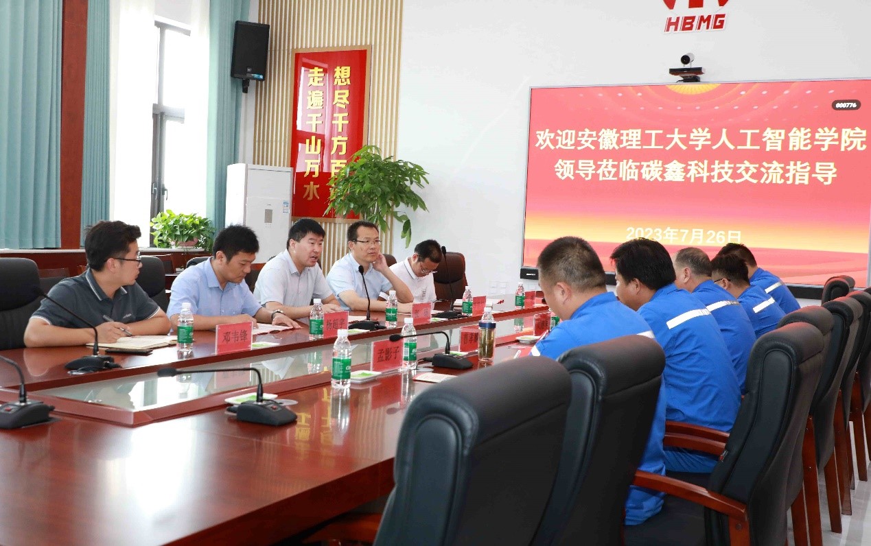 安徽碳鑫科技有限公司党委书记、执行董事张平,总工程师刘建军等负责人热情接待。张平对张旸一行表示热烈欢迎,并举行了研讨交流会。刘建军详细介绍了安徽碳鑫科技有限公司发展建设情况,希望在人才招聘、科研合作、平台申报等方面加强校企合作交流,互惠共赢。