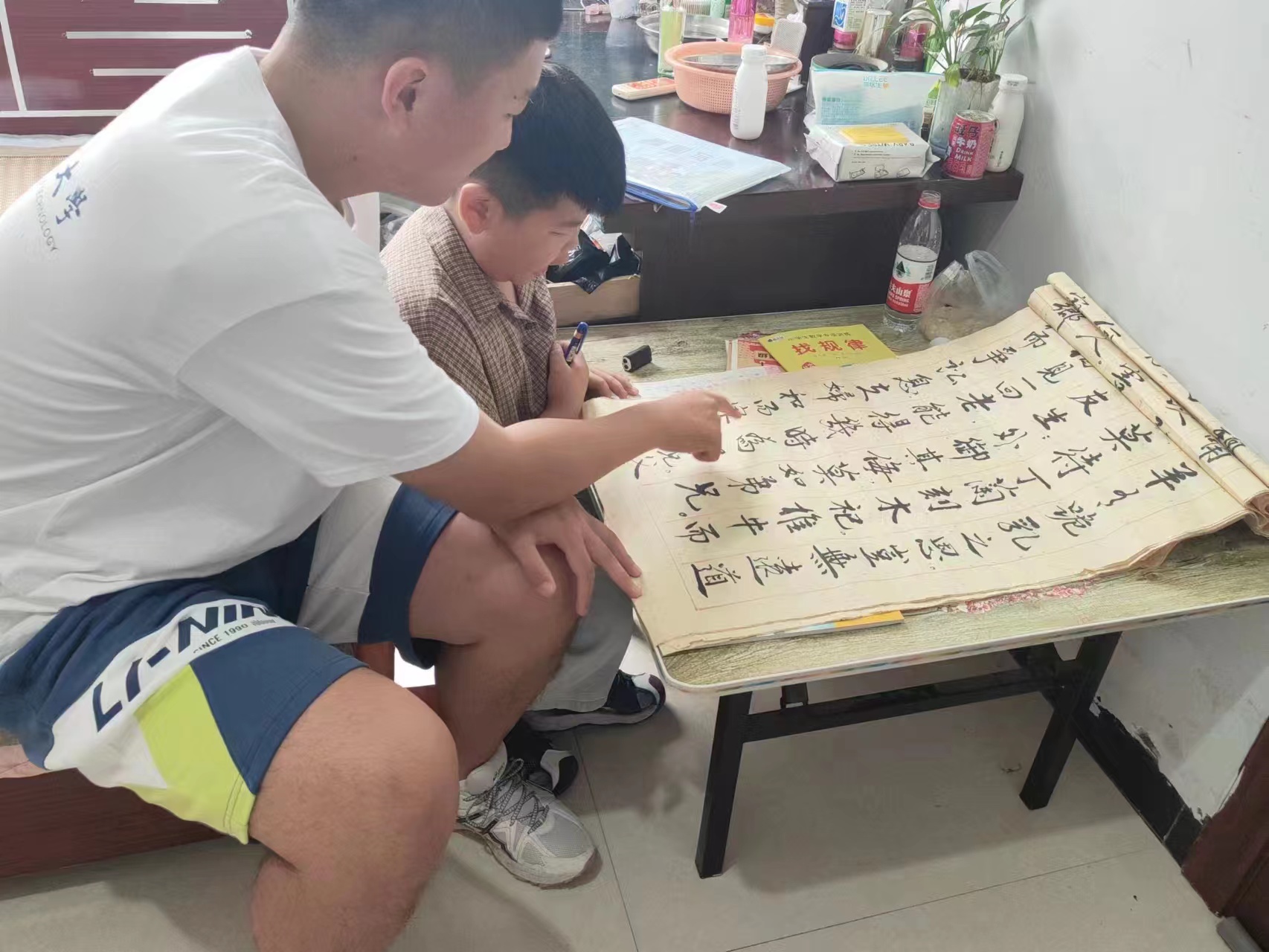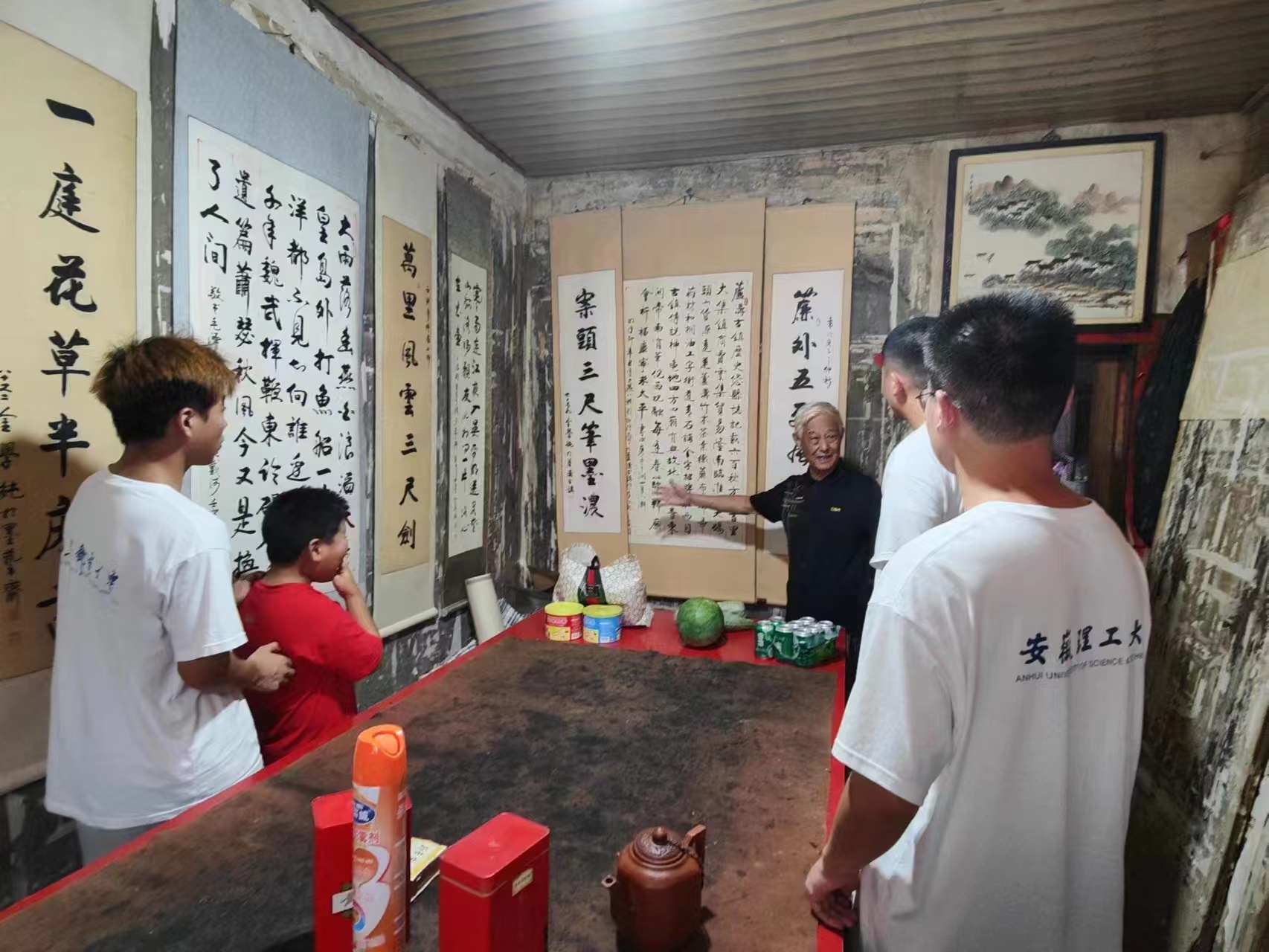7月25日,实践队员走进省书法家协会会员金学纯先生的“墨艺斋”,映入眼帘的是他创作的楷书、行书、行草书等不同书体的佳作。这些作品字法、墨法、章法都很精到,十里八乡求字者甚多,可谓是名扬一方。“当今的未成年人内心太过于浮躁,很少有人能够静下心来去钻研书法,这就导致了中国优秀的书法文化面临无人继承的窘境,请你们代替我向未成年人带句话,替我告诫他们要及时打磨自己的心境,静下心来去继承好中华优秀的书法文化,”这是在谈到青少年书法传承问题时,金学纯先生给实践队员的嘱托。实践队员们牢记在心,在接下来的实践活动中,将金学纯先生的期望融入宣讲内容,让孩子们在书法中感受古人的情怀和智慧,实现文化的传承和延续。