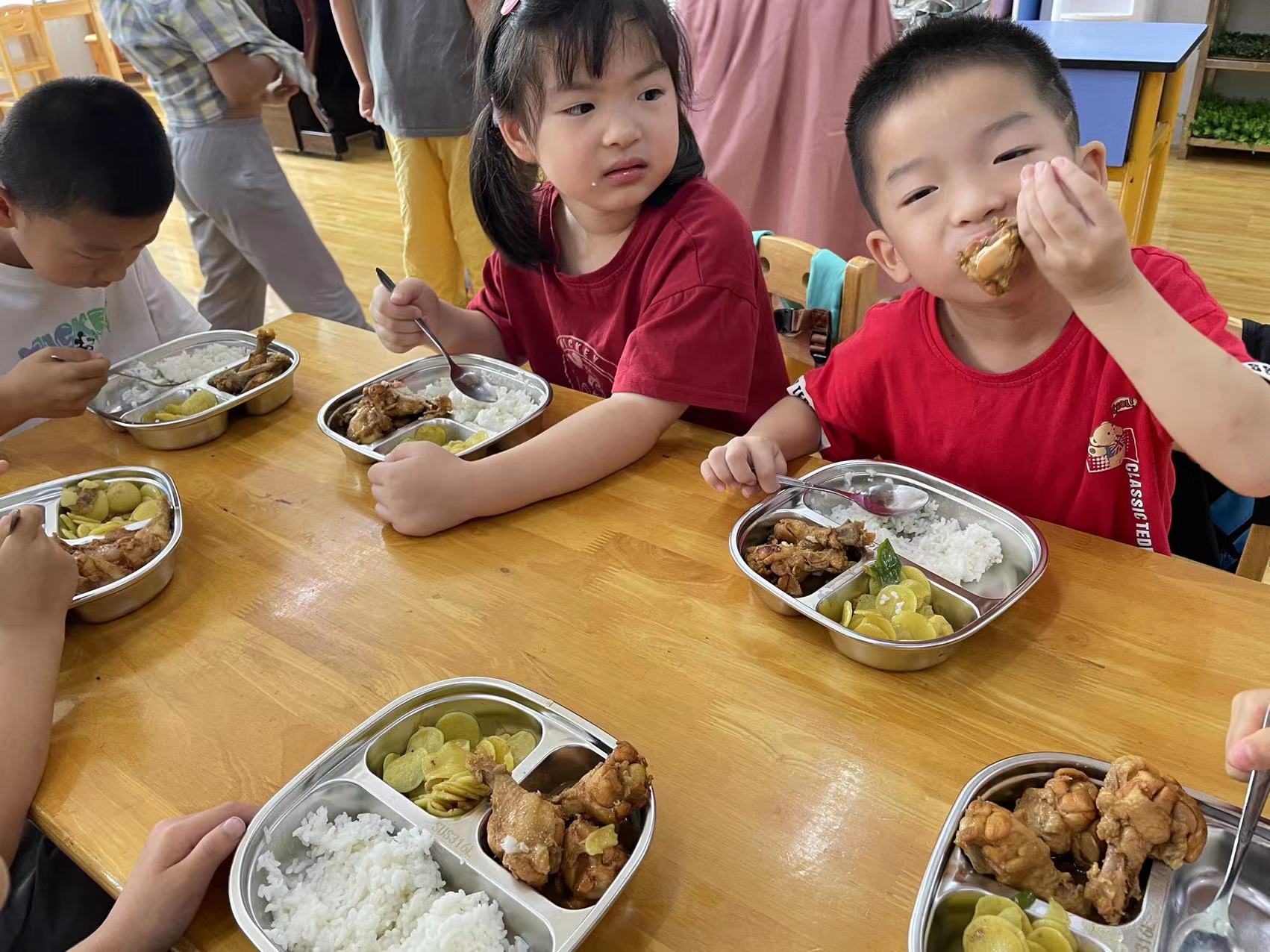 在幼儿园,为保障用餐安全,幼儿园厨房按照最新的食品安全管理规定进行了装修改造,配置了分装餐盘,餐品供应更安全、更丰富。总务部还组织对楼道墙裙更换、校园绿植修剪、室内环境保洁消杀等,为幼儿们创造更舒适的在园生活环境。