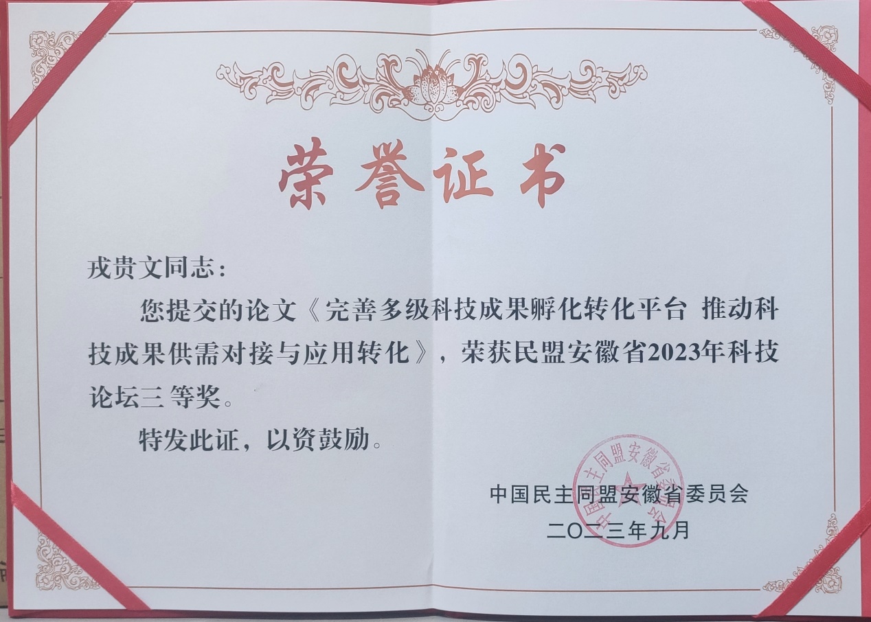 为加快科技成果转化应用,全面塑造发展新优势,助力安徽省推进高水平科技强省和创新型省份建设,9月16日至17日,民盟安徽省2023年科技论坛在蚌埠举办。民盟安徽省委科技委员会副主任、我校戎贵文教授参加论坛。