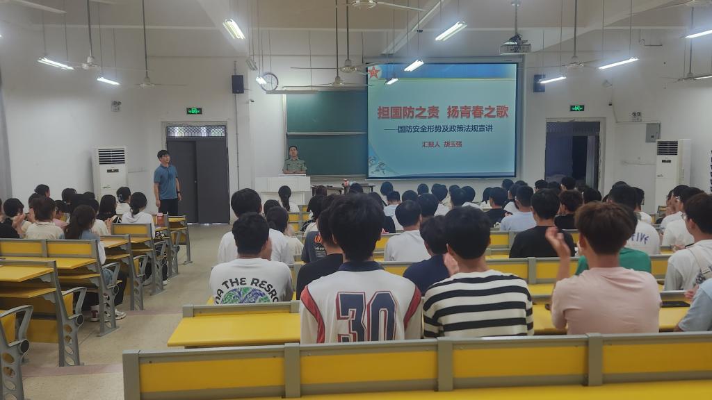 9月15日下午,人文学院邀请寿县县委常委、武装部政委胡玉强为全体新生开展国防教育。胡玉强简单介绍了当前世界面临的形势,表示新时代大学生必须要有所为、有所不为。他还详细讲解了大学生征兵入伍政策、优抚待遇,鼓励在校大学生勇敢携笔从戎,保家卫国,把小我融入大我,展现新时代大学生的担当与作为。