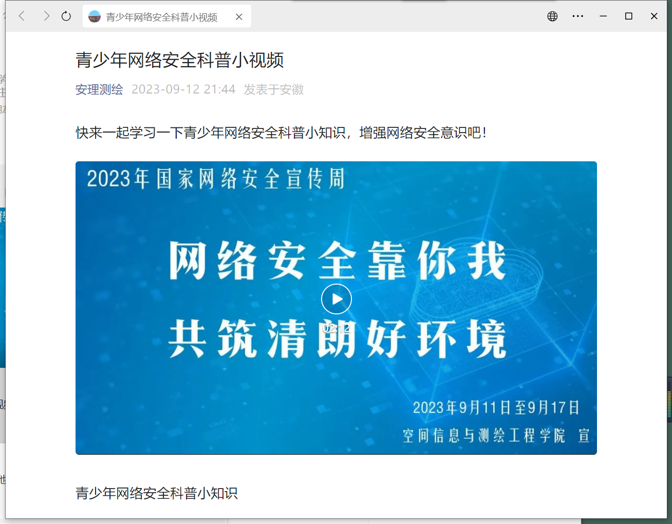 为深入贯彻落实习近平总书记关于网络安全的重要指示精神,进一步普及网络安全知识,提升网络安全意识和防护技能,营造网络安全人人有责、人人参与的浓厚氛围,9月11日至17日,空间信息与测绘工程学院开展了国家网络安全宣传周系列活动。