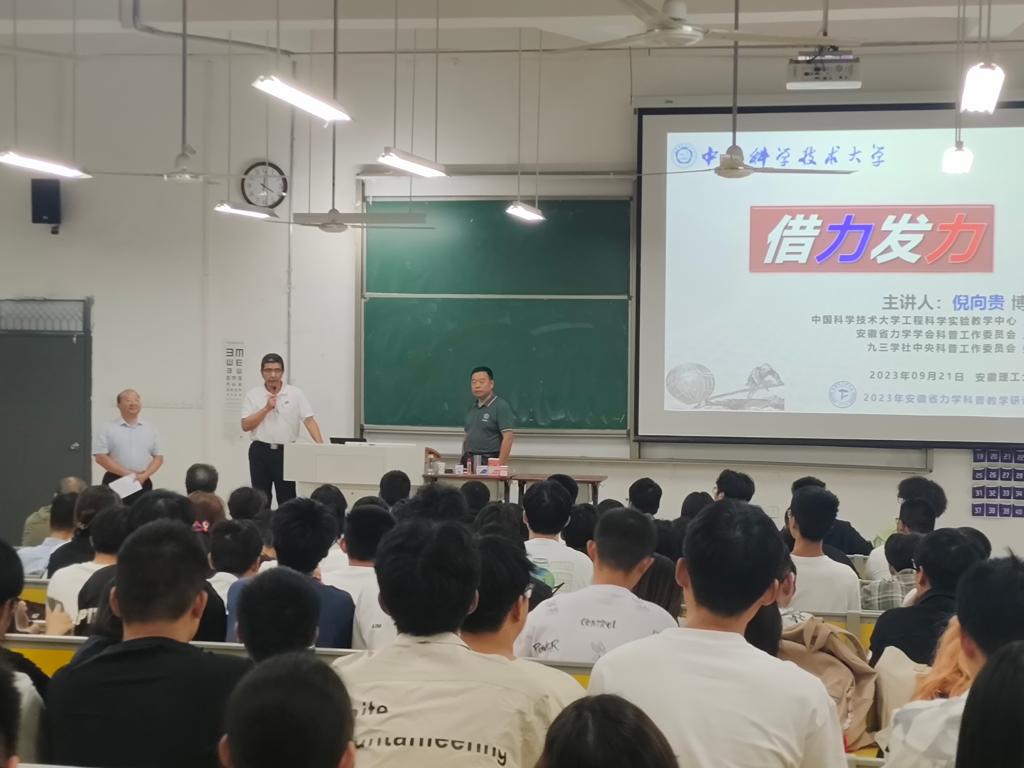 9月21日下午,中国科学技术大学工程学院工程实验教学中心主任、安徽省力学科普工作委员会专家倪向贵一行来我校为低年级大学生作力学科普报告。校党委常委、副校长董雨出席报告会并讲话。报告会由土木建筑学院院长荣传新主持。