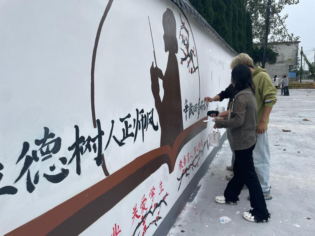 一面墙壁一方凝聚,一面墙壁一方文明乡风。活动中,同学们充分发挥想象力与创造力,以墙壁为画布,以生态文明、安全常识、健康体魄等为主题设计图案,用手中的画笔将尊师重教的理念融入墙壁绘画的艺术表达,他们用多姿多彩的颜色描绘今日乡村的美丽景色与美好生活,以实际行动展示安理学子投身乡村振兴的责任与担当。