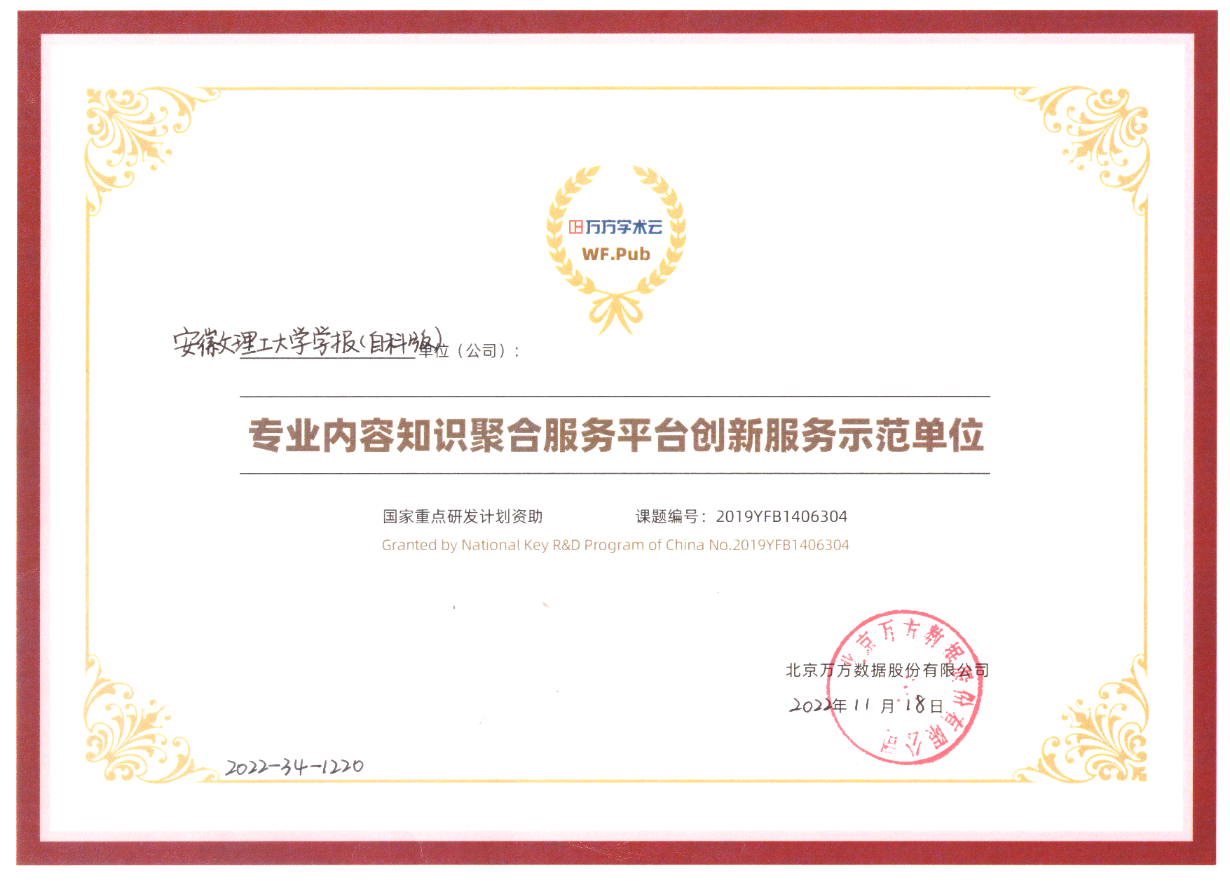 近日,《安徽理工大学学报(自科版)》荣获北京万方数据股份有限公司组织授予的“专业内容知识聚合服务平台创新服务示范单位”称号。