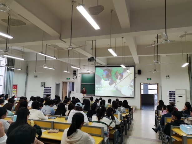 张菁在讲座中结合自己的翻译经历,围绕武侠小说的特点、阅读体验、角色塑造等内容,以郭靖、黄蓉、梅超风、杨过、小龙女等小说人物为例子,讲解分析了翻译作品实例,解释译者是如何解读原文文本、挖掘角色信息,为英译本重新塑造有血有肉的故事人物,并展示了翻译在传递原文内容时会带上具有主观性的写作阐释。讲座趣味十足、引人入胜。互动环节,学生踊跃提问,向张菁请教如何进行人物翻译,如何用英文地道表达语言,如何翻译才能使外国读者理解中国传统道德、文化特色等问题,张菁结合自己的翻译实践作出精彩回复,并鼓励英语专业的同学多阅读、多学习、多尝试、多体验,抓住时代机遇,加入到国际传播事业中,做好跨文化沟通的桥梁和纽带。