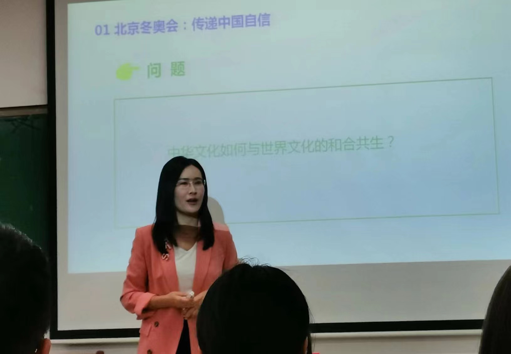 会议邀请人文社会科学学院党委书记王大贤以“形势与政策课教学研讨”为主题进行了心得分享。王大贤以一名老教师的身份,分析了上好形势与政策课的难点,分享了自己的备课上课经验。马文婷老师以“北京冬奥会”为主题进行教学展示,给大家带来了一节高水平的形势与政策课。