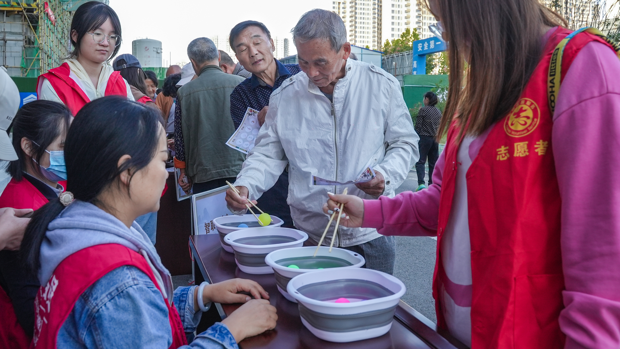 学院党委主要负责人代表领导班子和全体师生员工向社区广大老年人致以节日的祝福和诚挚的问候。本次重阳节敬老主题活动共设“国风大投壶”“幸运套圈圈”“智取乒乓球”“快速指东向西”“智力百科猜题”“沙包积分比拼”等6个环节,老年朋友们在社区工作人员和学院学生志愿者的引导下积极参与趣味竞技。活动中,来自英伦联邦小区的退休老职工吴阿姨表示:“学校和社区组织的这次活动,为我们这些留守老年人搭建了一个同辈交流互助的平台,不仅丰富了我们老年人的生活,更是增强了我们老年人的幸福感!”