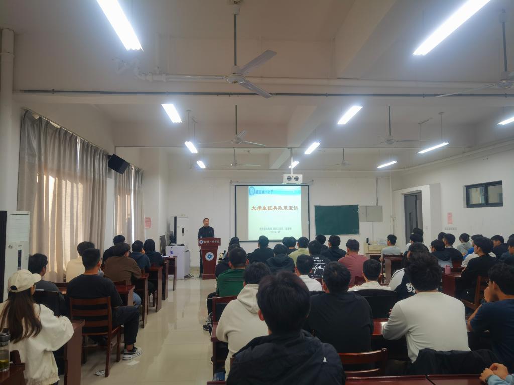 徐意刚老师从大学生入伍意义、大学生入伍优惠政策、应征入伍条件、报名流程等方面进行讲解,详细介绍了2023年最新入伍政策,话语中饱含着对青年大学生立志军营成才的真诚期望。他激励广大青年学子要把自己的爱国情怀与国防现代化建设事业相结合,携笔从戎,投身国防,在实现强军梦的伟大实践中书写精彩人生!