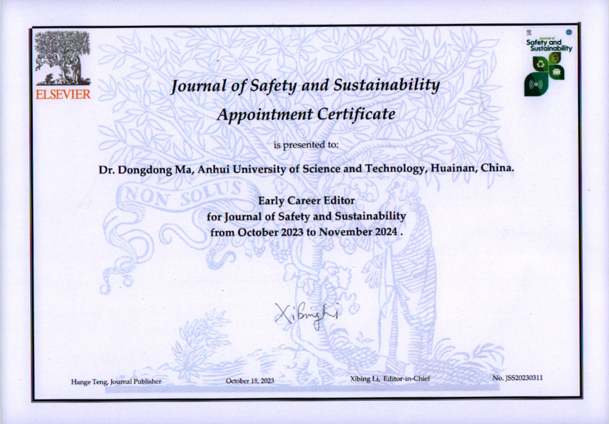 会议期间,由中南大学主办、Elsevier出版的英文科技期刊Journal of Safety and Sustainability召开了首届青年编委会会议,马冬冬副教授被聘为期刊的首届青年编委。
