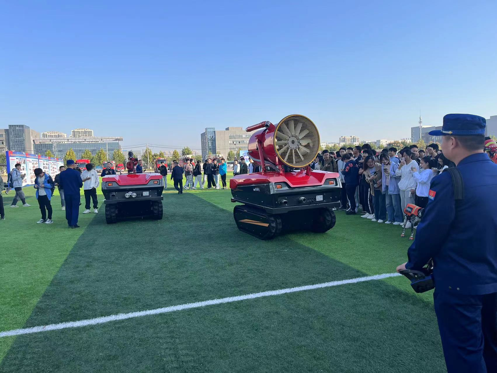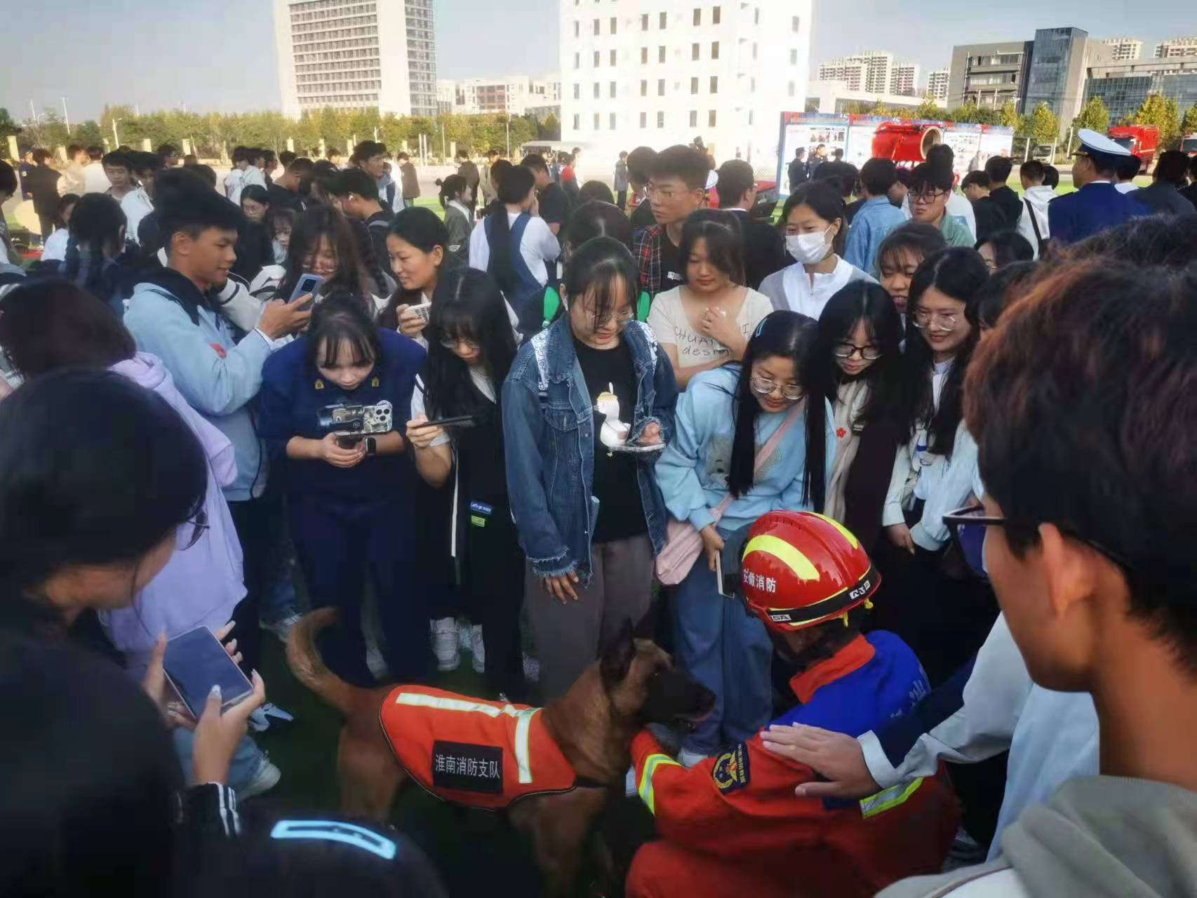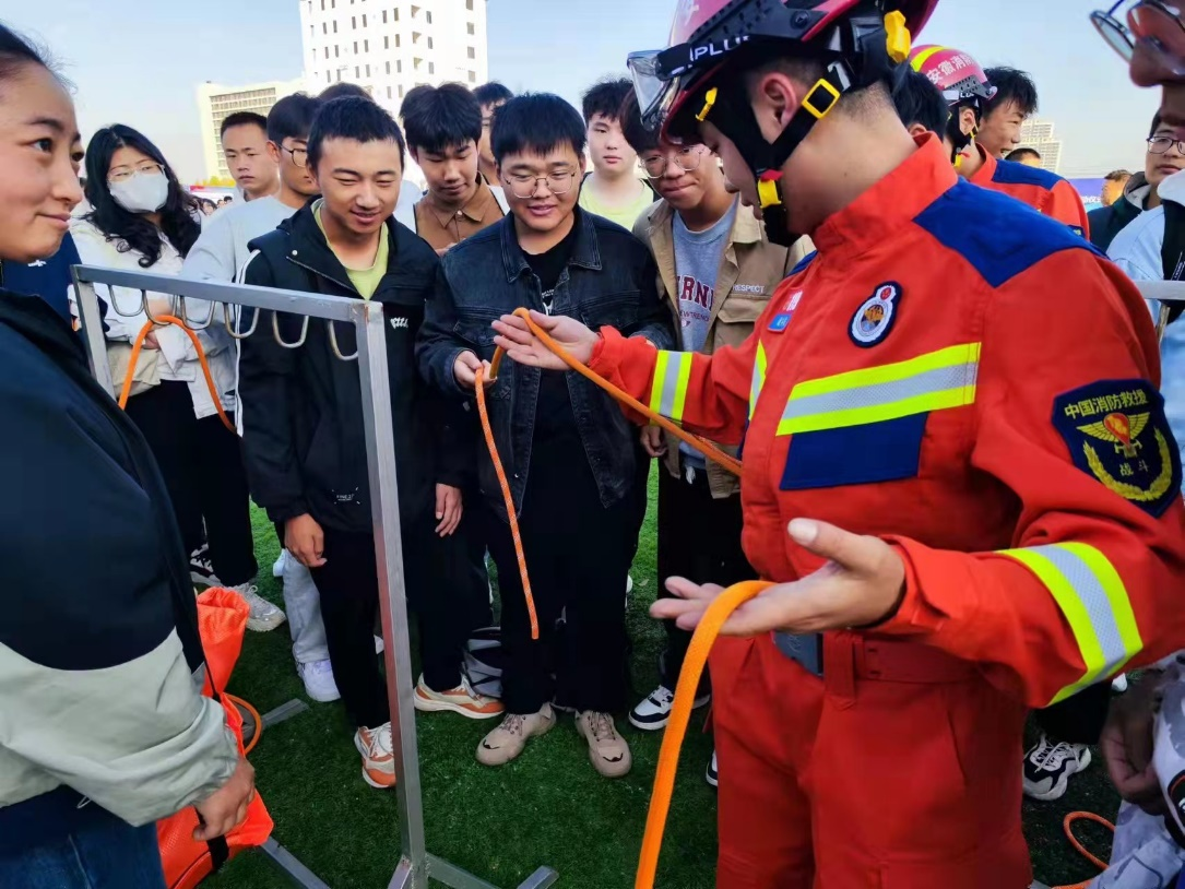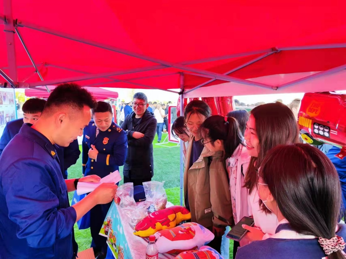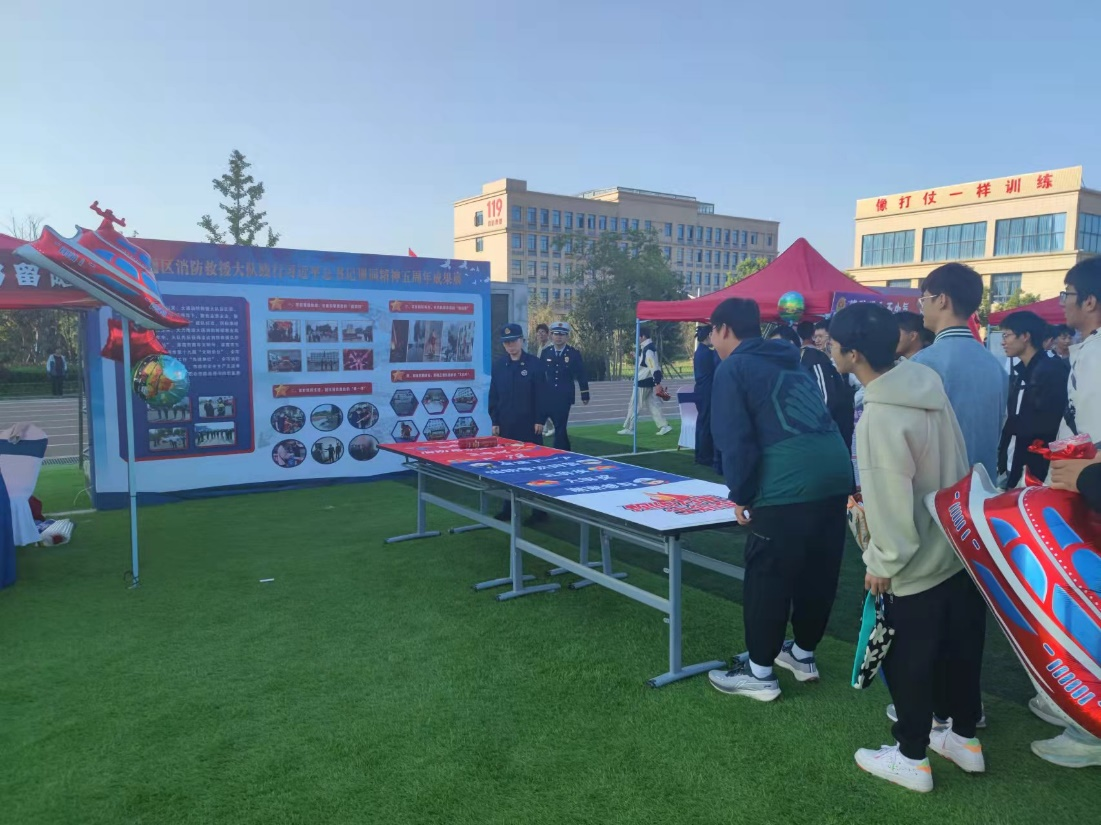 活动现场,消防文化墙、典型火灾案例展、搜救犬表演、消防互动体验、消防装备及救援车辆展示等主题活动区域,吸引众多学生参观、体验。