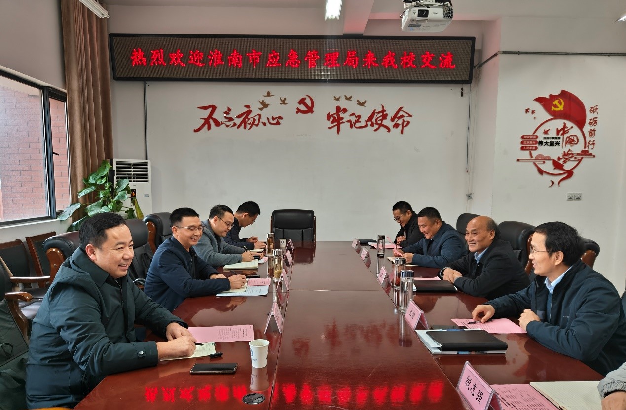 徐军林介绍了淮南市应急管理局基本情况,指出淮南市应急管理局在不断加强与安全科学与工程学院和矿业工程学院的交流中,彼此建立了深厚感情与合作意愿,从而为双方在应急管理、安全生产各领域积极探索“政校”合作新机制、新模式打下了良好的基础,并希望借助学校学科优势和人才优势,在安全生产、应急管理、防灾减灾、人才培养、教学实践基地建设等方面进一步加强交流,拓宽合作领域,推动务实合作。李旭光介绍了淮南市矿用产品产业链的调研情况,双方就煤矿安全生产产业情况进行了深入交流。