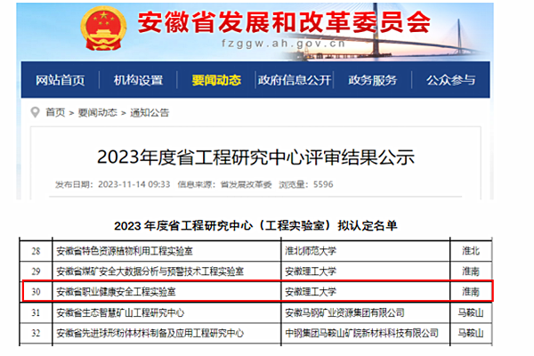 近日,安徽省发展和改革委员会发布2023年度省工程研究中心评审结果,依托我校建设的安徽省职业健康安全工程实验室成功通过验收。