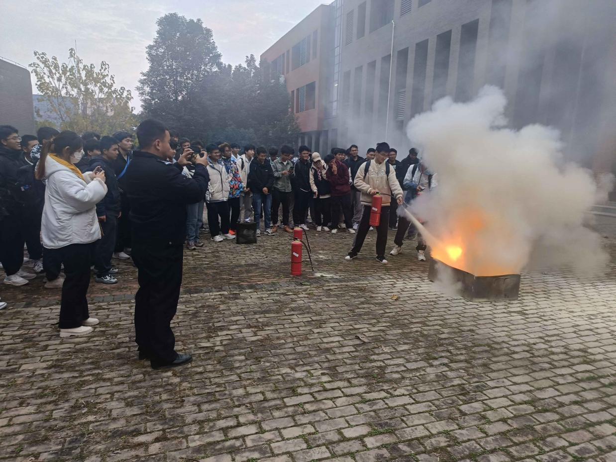 讲座结束后,学院组织参会师生开展了疏散演练,并在户外就常用灭火器的正确使用进行了实际操作培训。实操现场模拟起火点,师生代表分组分批亲身体验,扑灭火槽明火。